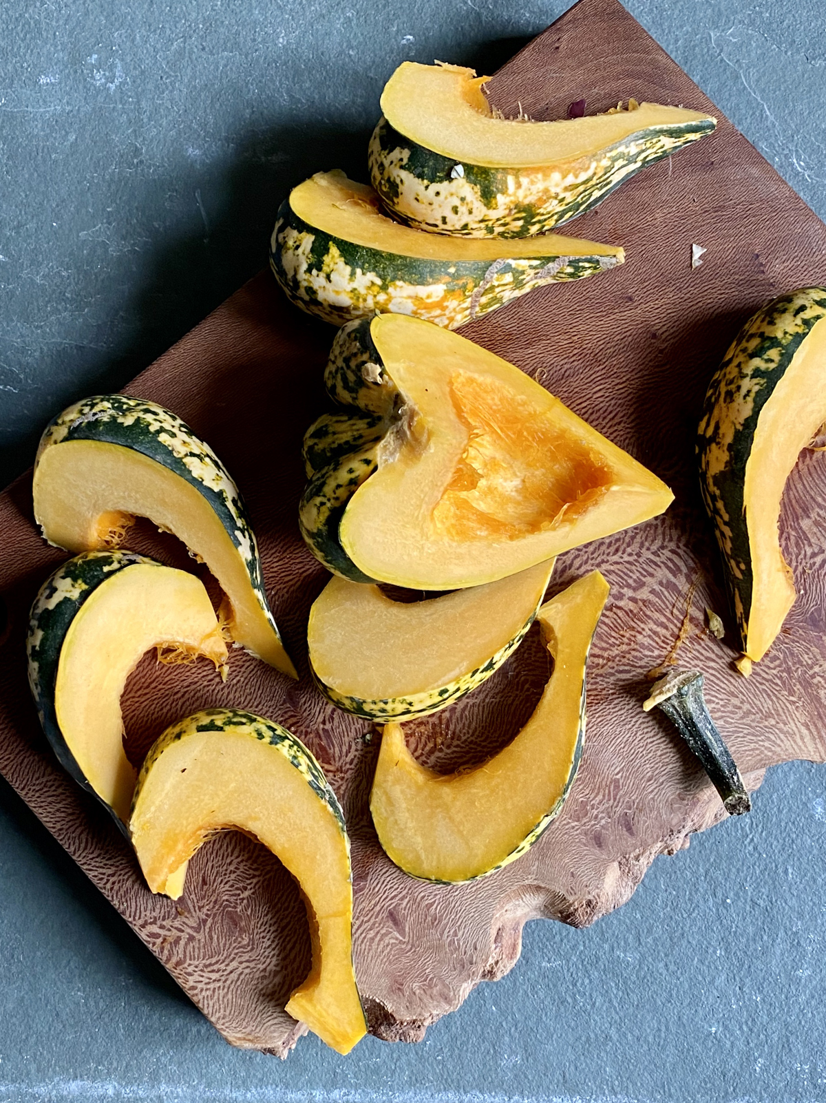 While the chicos are cooking, carefully cut the winter squash into wedges and place on a baking sheet or roasting pan. Mix the other half of the oil with the green chile powder and cumin and brush on to the squash wedges. Sprinkle generously with salt and place in the preheated oven. Turn the wedges after about 10 or 15 minutes and cook for another 10 or 15 or until you can easily insert a knife into a wedge.